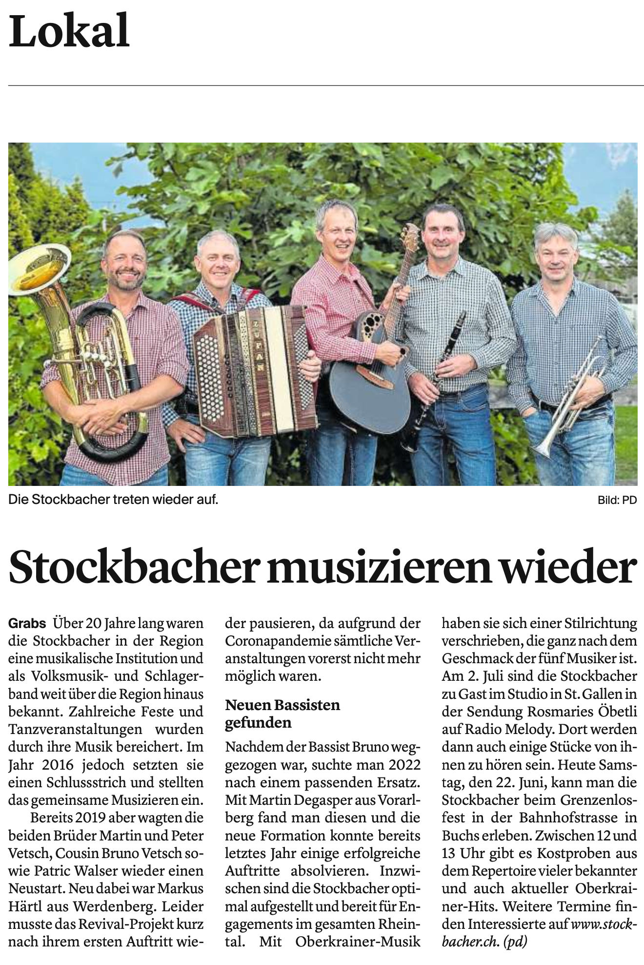 Werdenberger & Obertoggenburger: Zeitungsbericht, Unterhaltungsmusik-Revival: Die Stockbacher musizieren wieder.